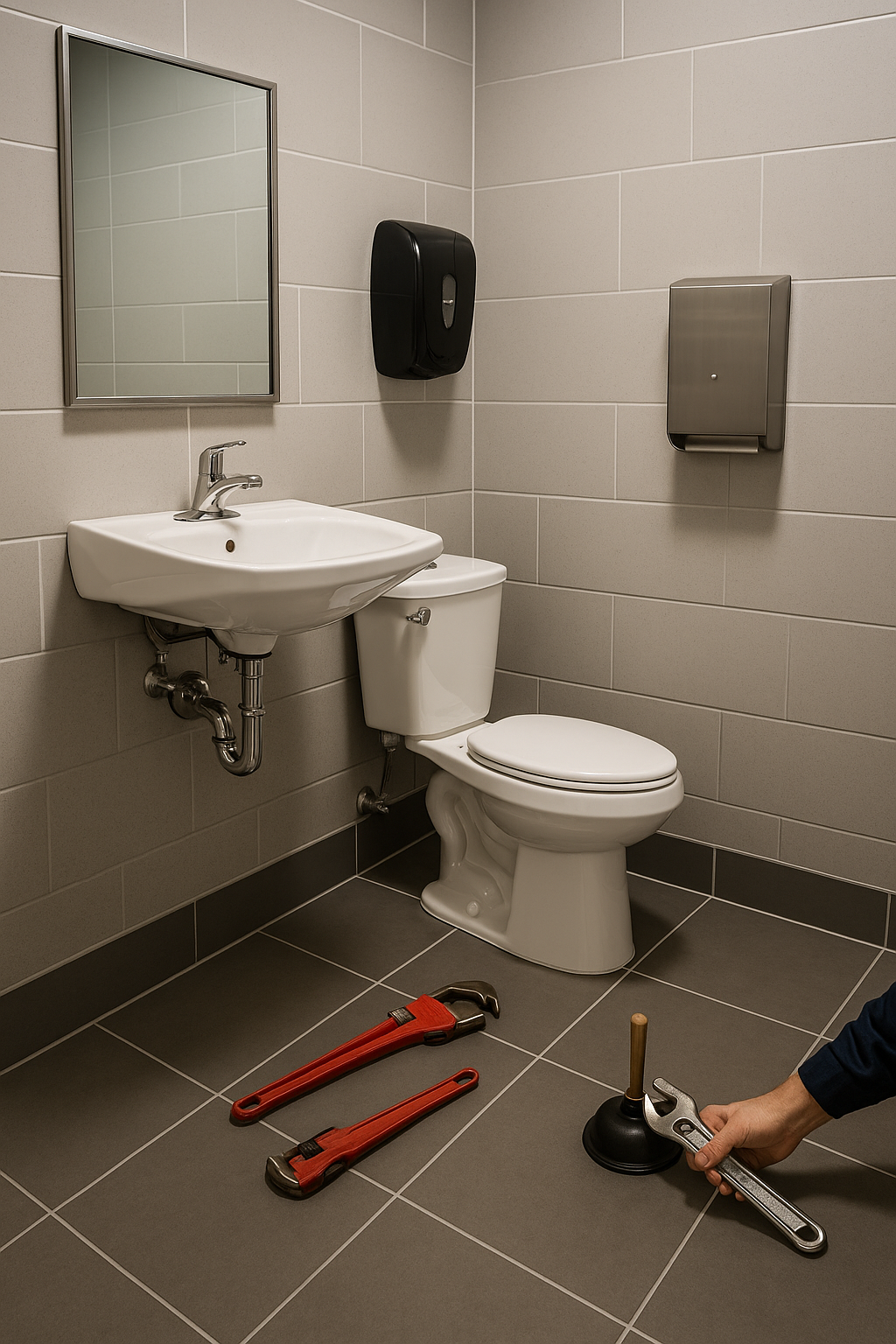 This modern commercial restroom features a clean toilet, wall-mounted sink, and updated dispenser fixtures—ideal for illustrating commercial restroom repairs and plumbing services in Janesville and Southern Wisconsin.