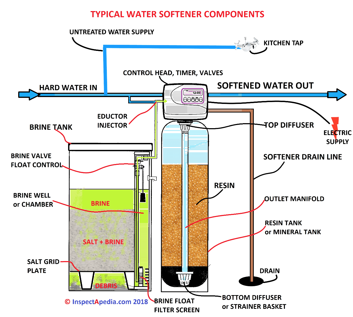 Understanding the components of a water softener system is essential for proper installation and maintenance. This diagram details the internal parts of a water softener, including the brine tank, resin tank, top and bottom diffusers, control head, and the process of converting hard water into soft water. A properly functioning water softener protects plumbing, extends appliance life, and improves overall water quality.